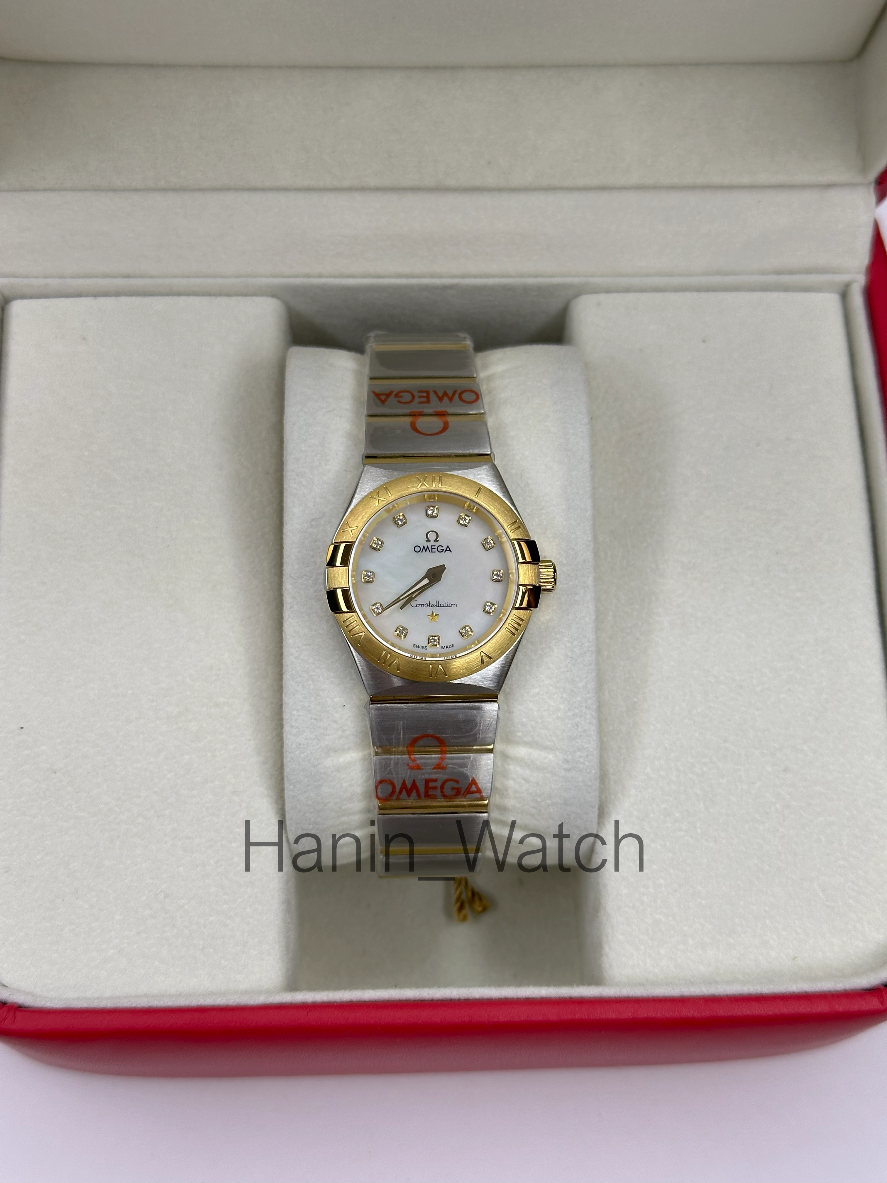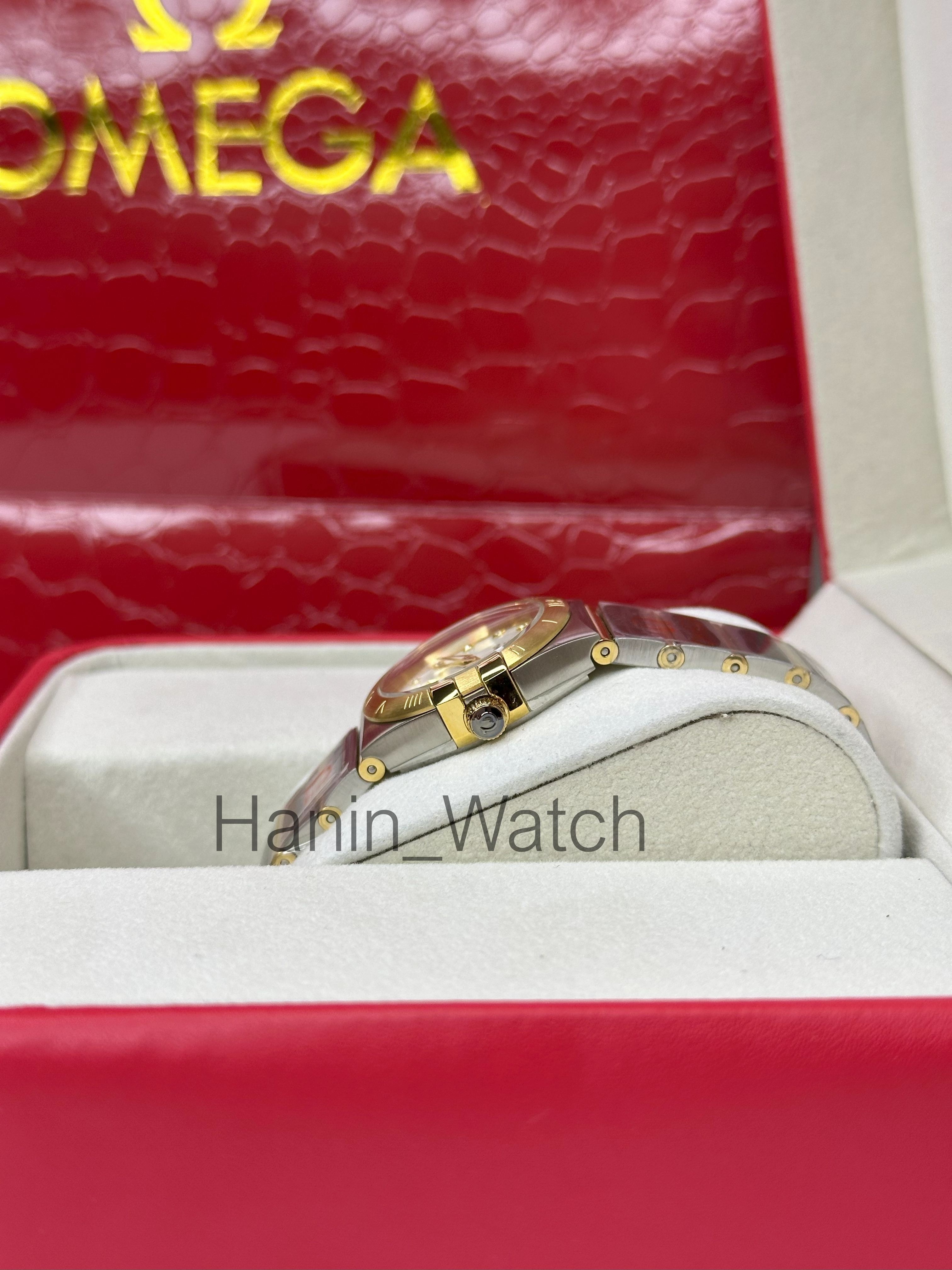ساعت مچی امگا کانسلیشن صفحه مرواریدی هفت رنگ نگین دار بند استیل دورنگ طلایی