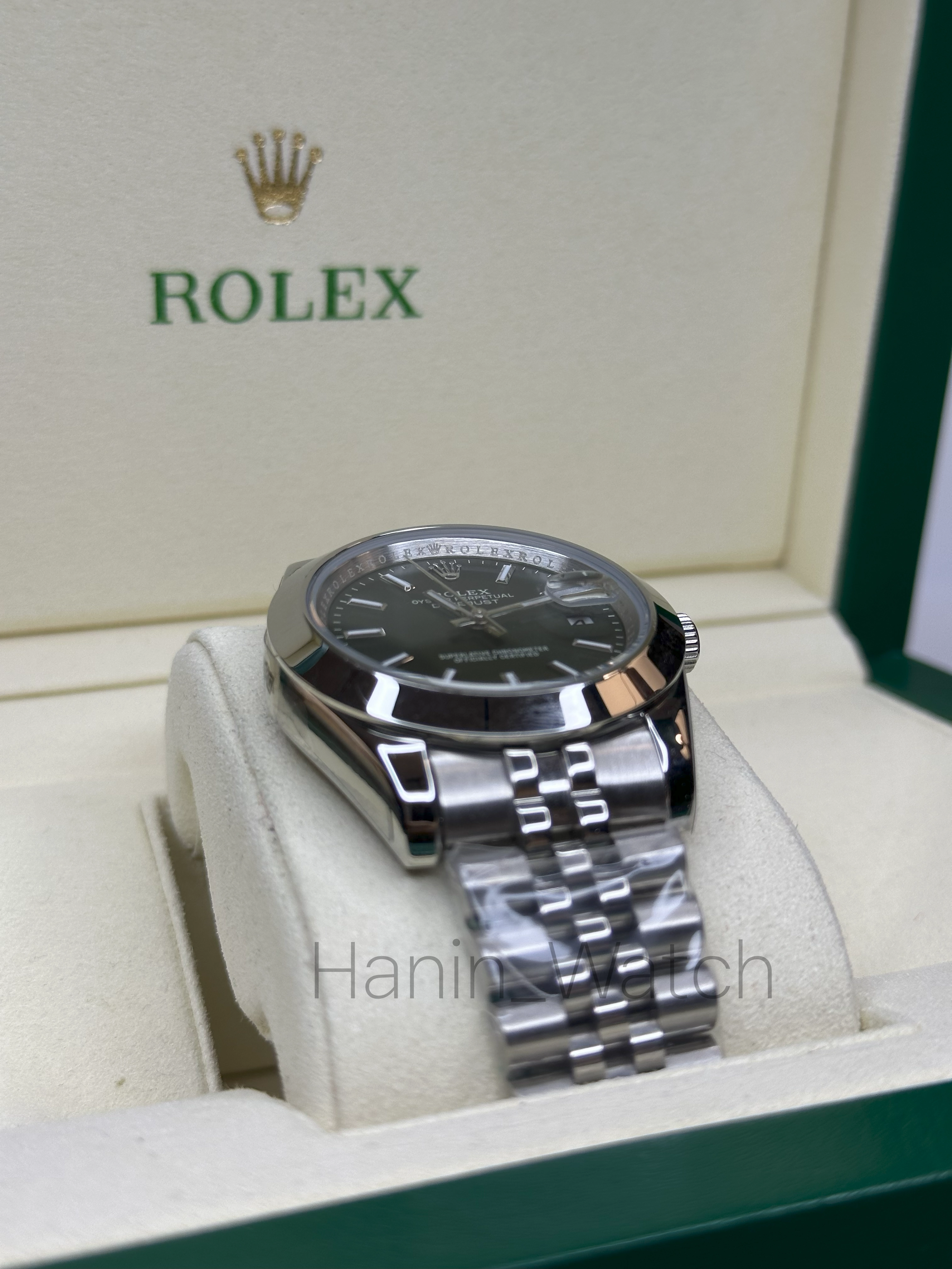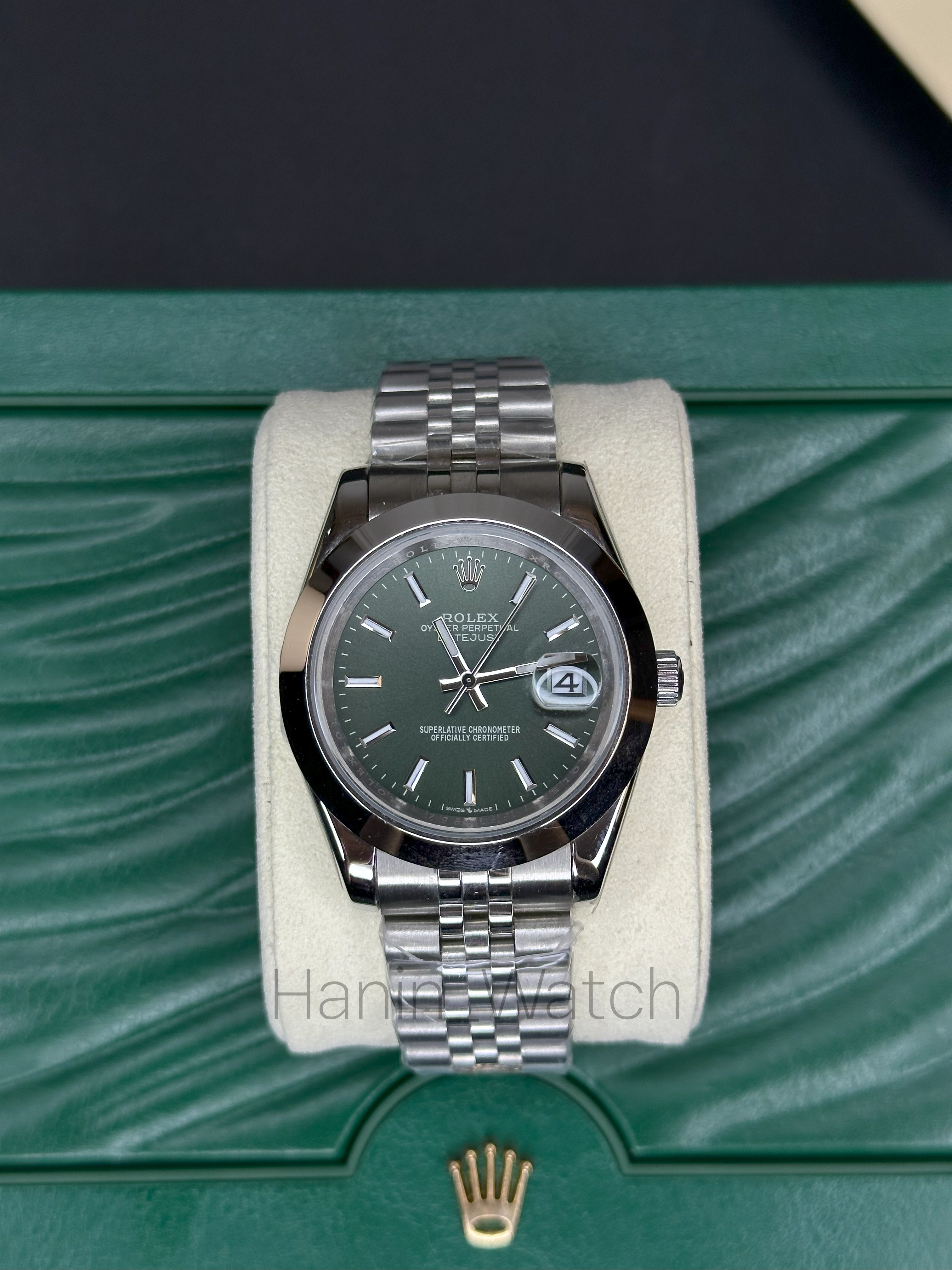 - برند و مدل: Rolex Datejust (Oyster Perpetual)، رفرنس 126334 (صفحه سبز، بند Jubilee)