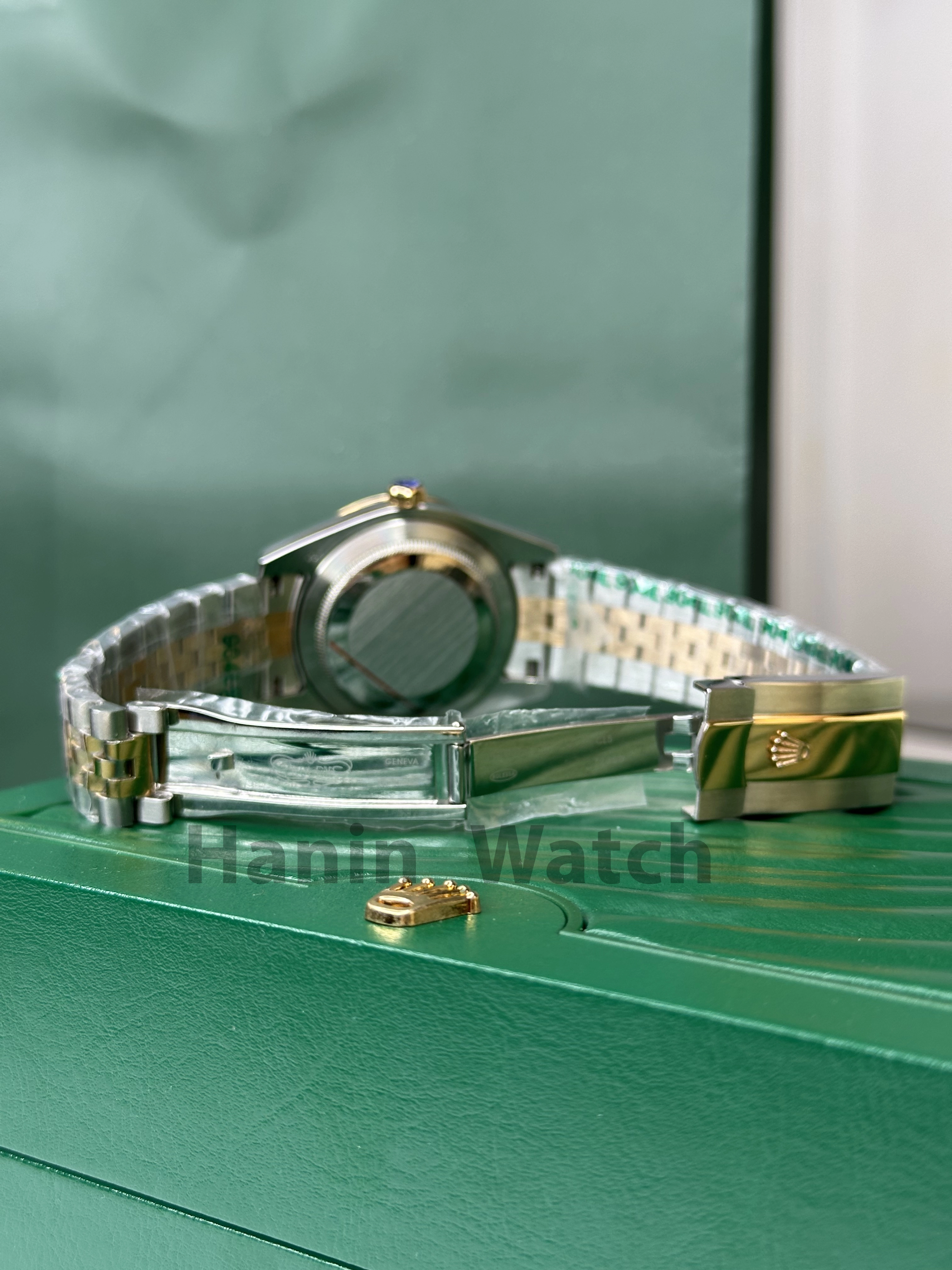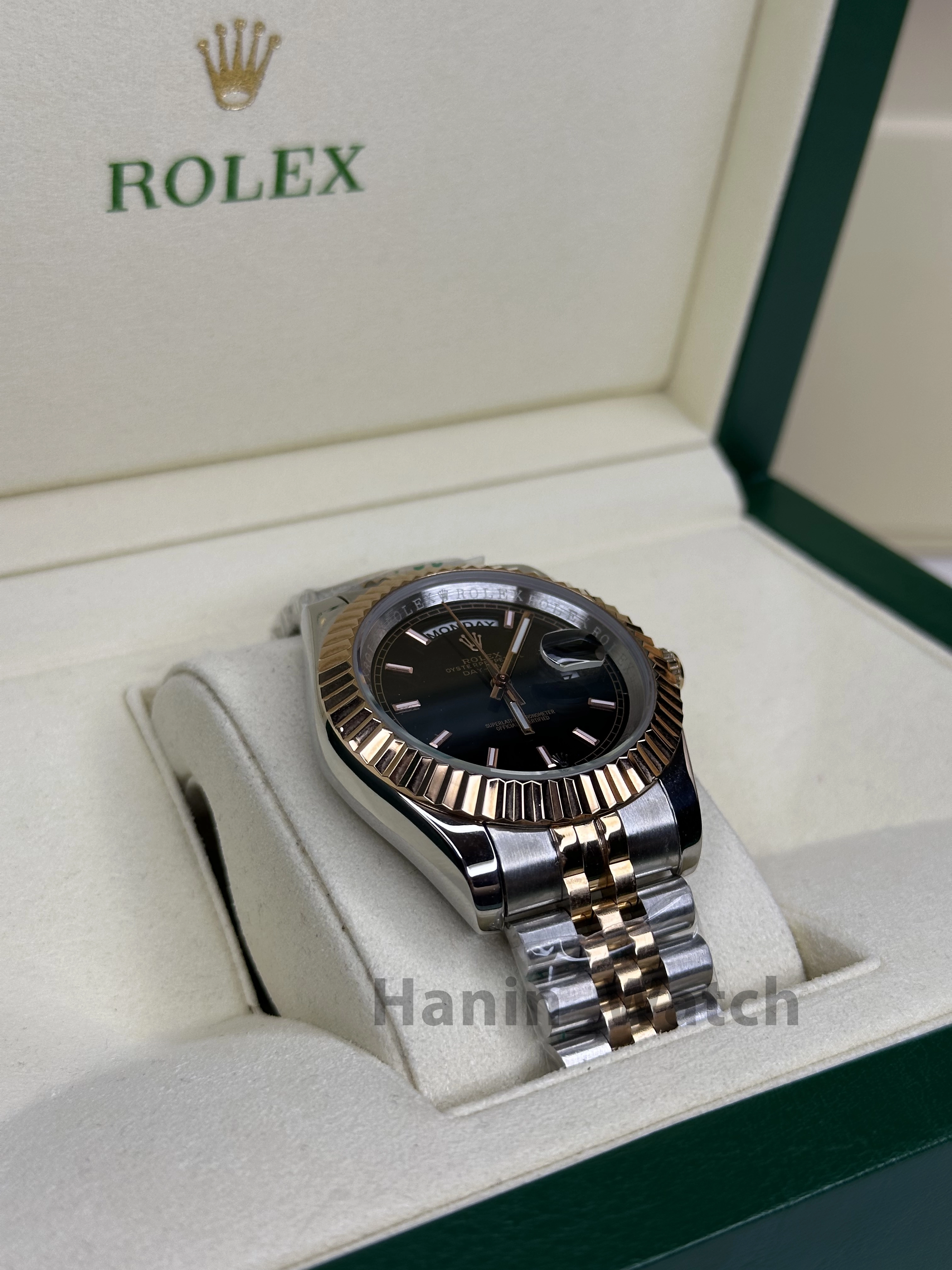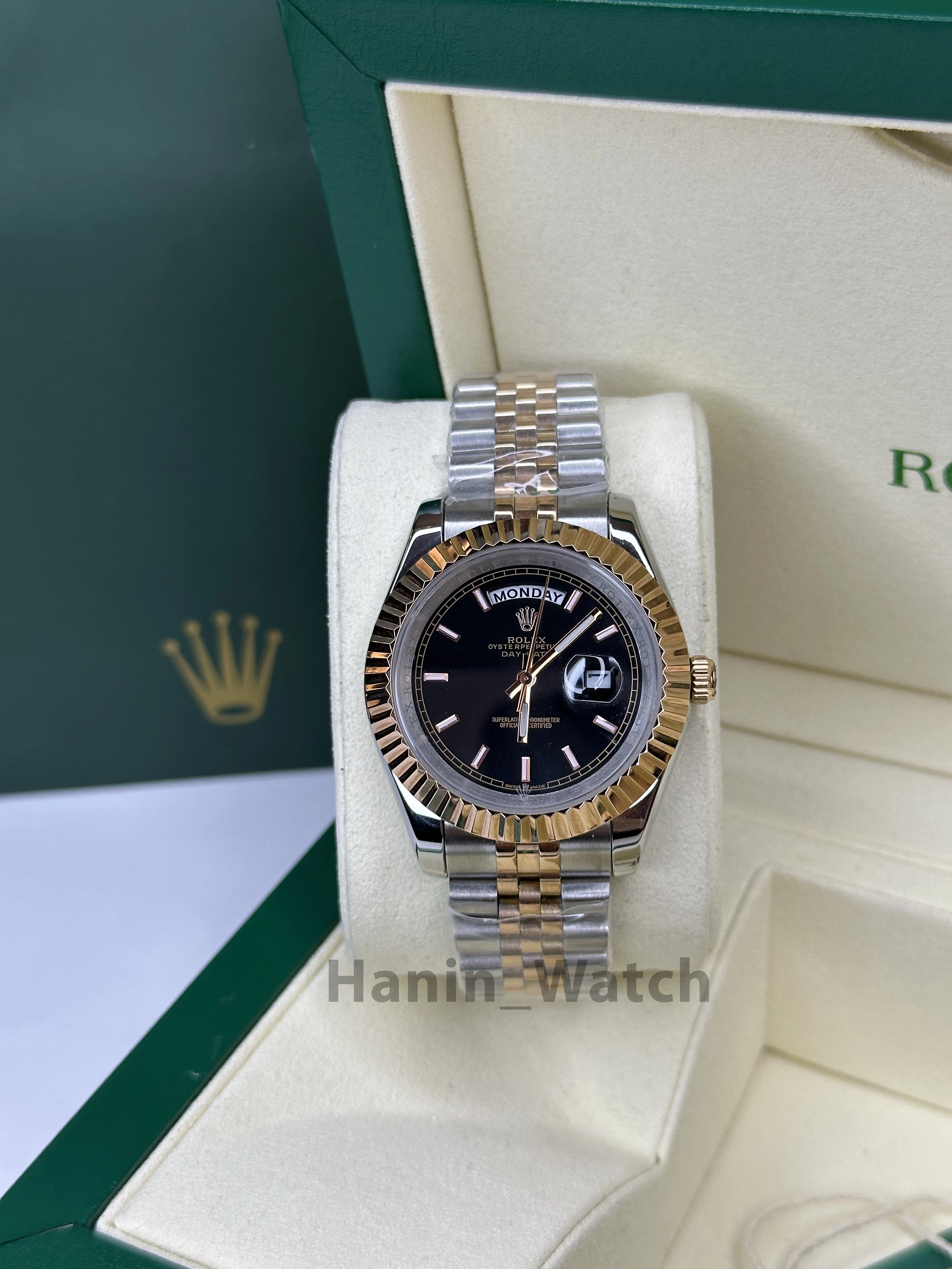 ر دنیای ساعتهای لوکس سوئیسی، ساعت Rolex Day-Date (معروف به Presidents Watch) با مشخصات برترش، گزینهای ایدهآل برای مدیران حرفهای و کلکسیونرها است. این مدل دو رنگ با صفحه مشکی، قاب فلuted طلایی، نمایش روز "WEDNESDAY" و تاریخ "28" با Cyclops، ترکیبی از تجمل و دقت رو ارائه میده. ساعت در نمای استودیویی ایزوله با نورپردازی یکنواخت قرار گرفته و جزئیاتی مثل Rehaut حکاکیشده ("ROLEXROLEX...") و لوگوی تاج رو برجسته میکنه.